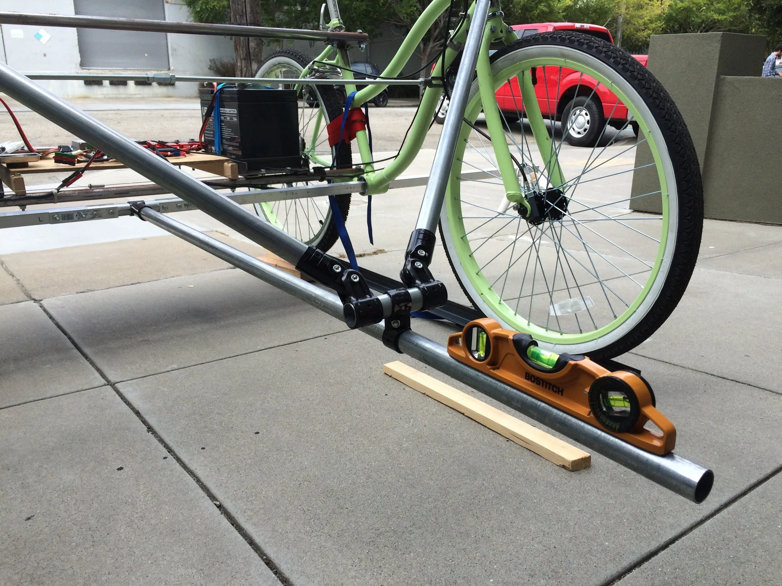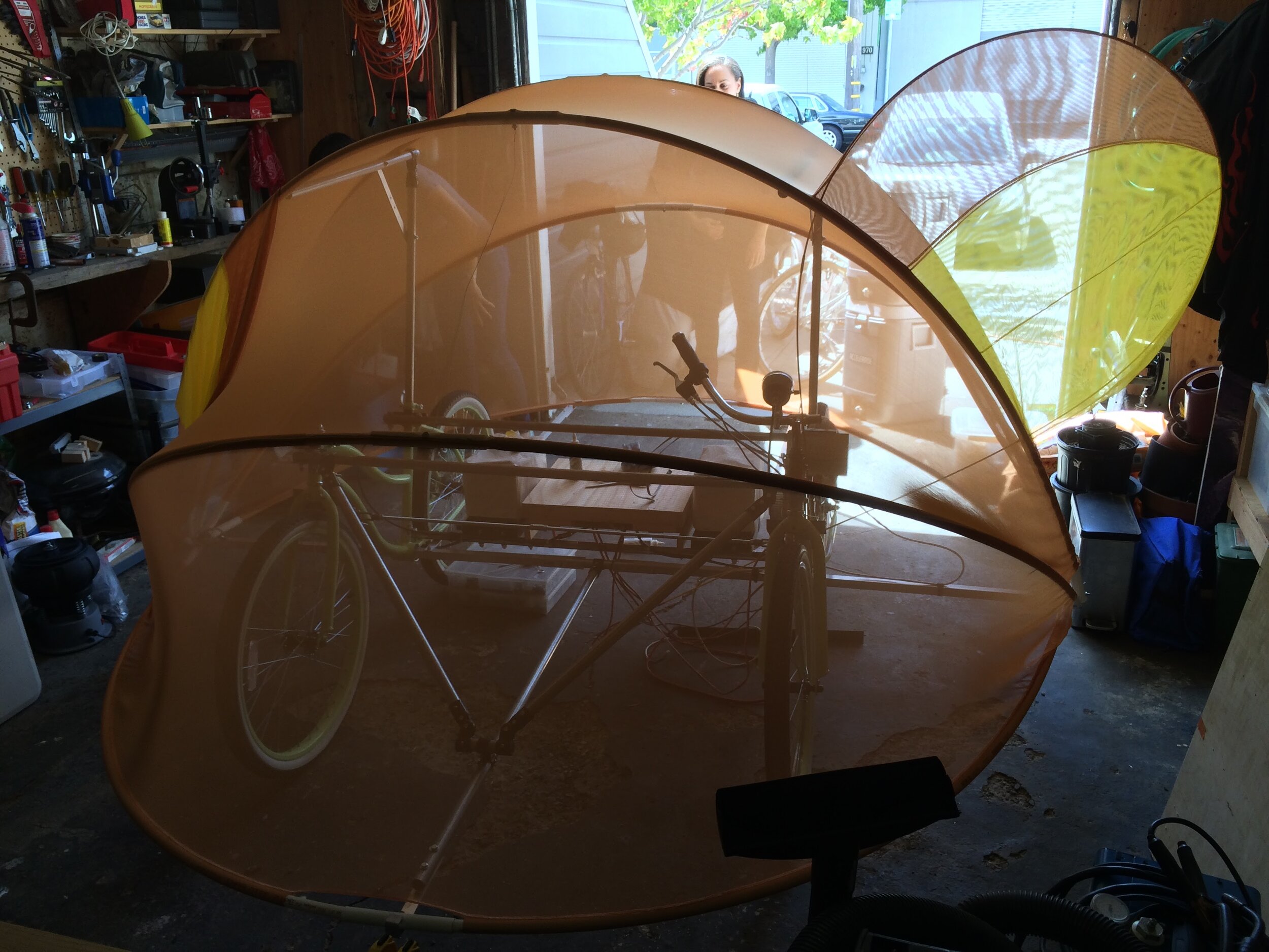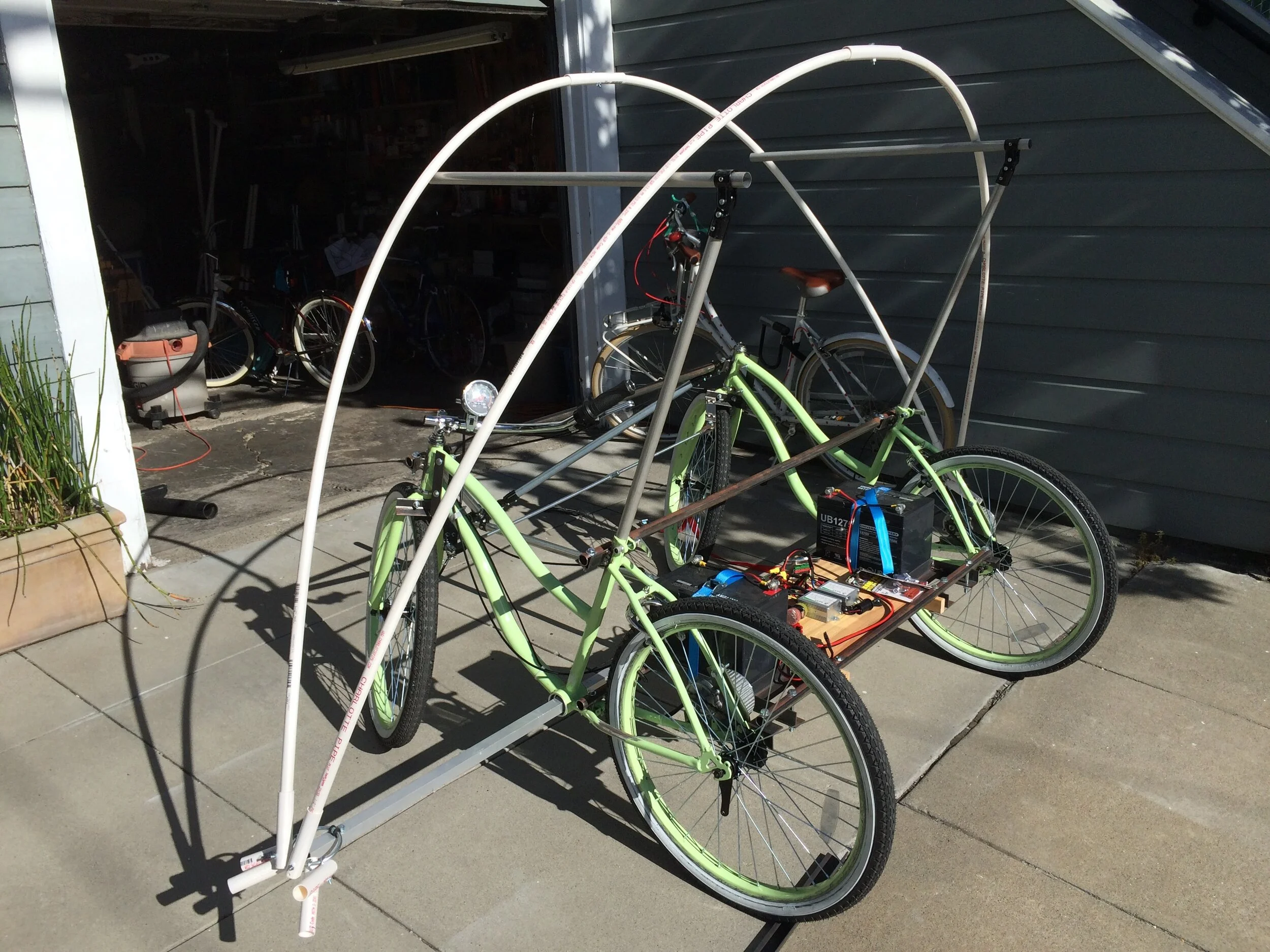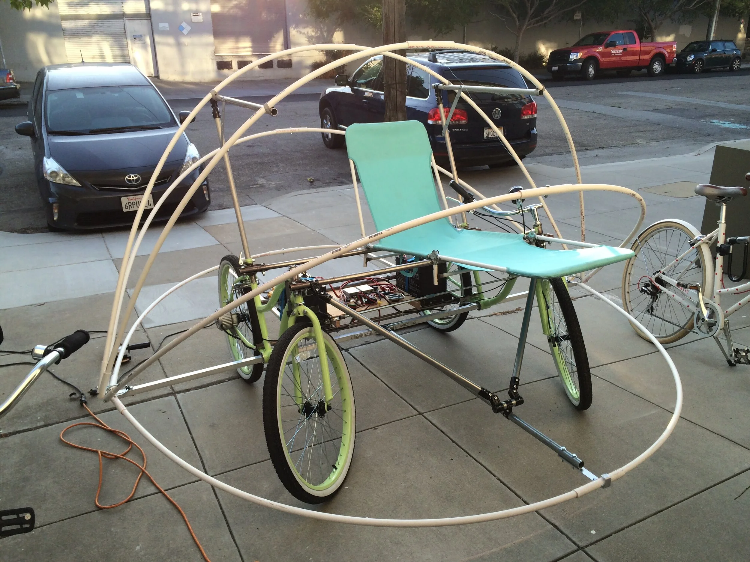 The car is made from two bicycles joined by parts that Garth fabricated to hold them together. In particular, he linked the front wheels via ball joints which implemented Ackermann steering geometry to drive the car. It is powered by two 350-watt motors. The outer shell is made of PVC pipe and sewn, stretched fabric.