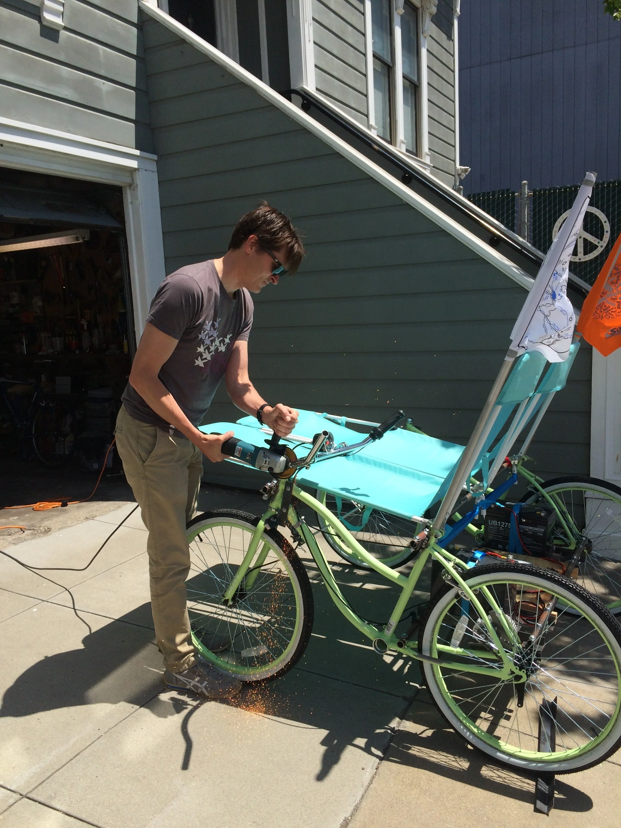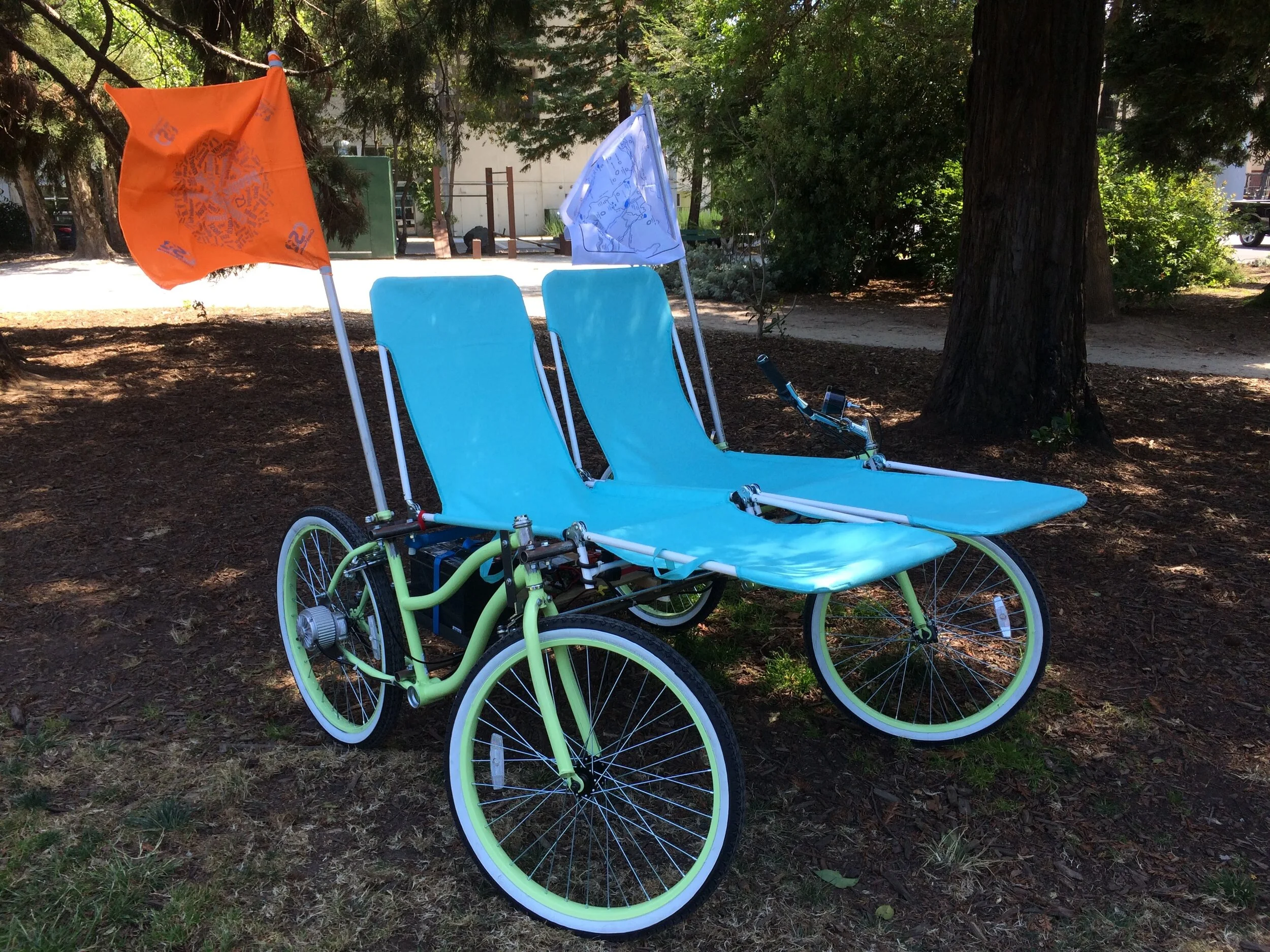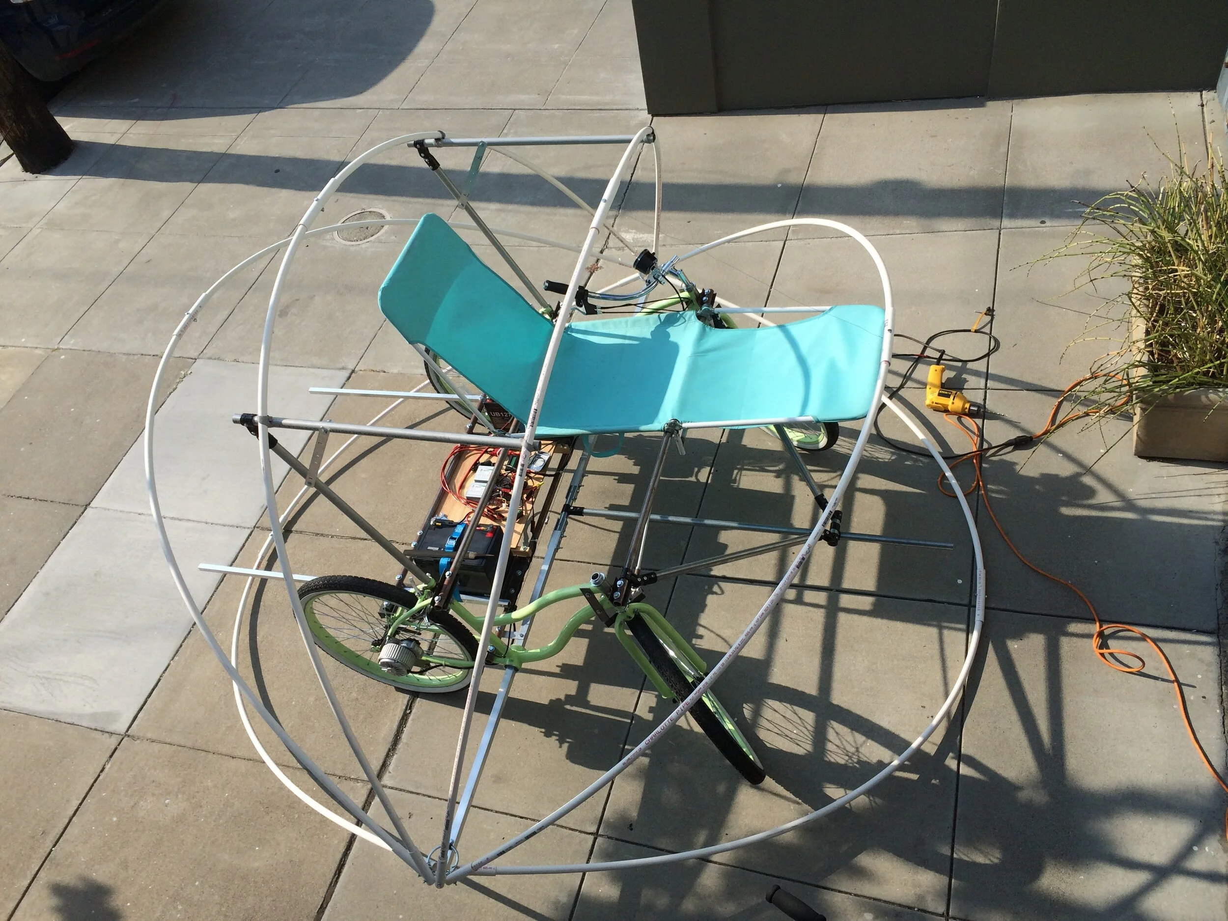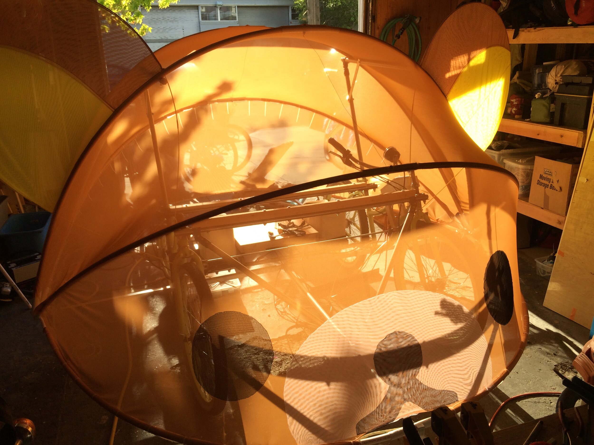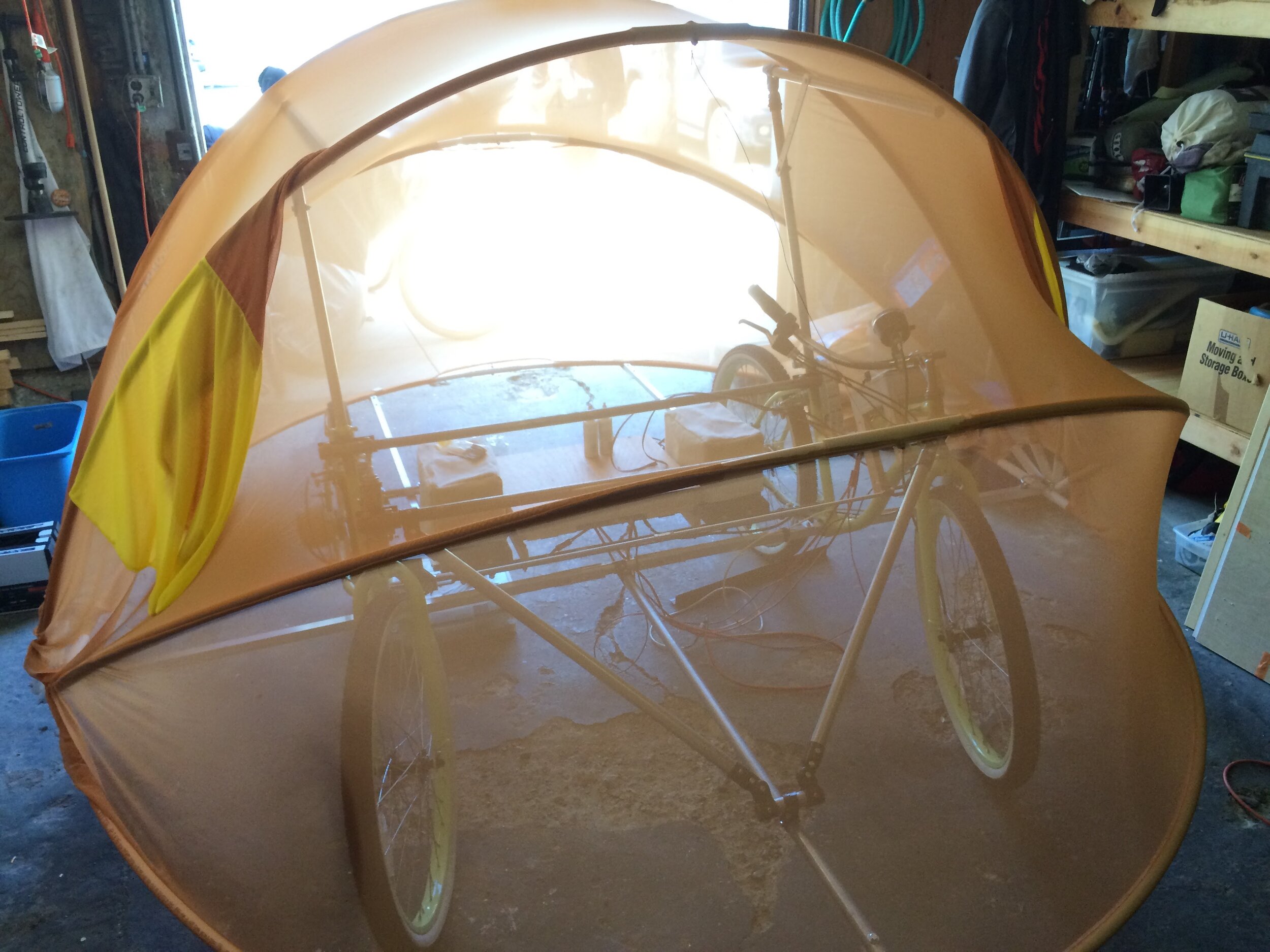 The car is made from two bicycles joined by parts that Garth fabricated to hold them together. In particular, he linked the front wheels via ball joints which implemented Ackermann steering geometry to drive the car. It is powered by two 350-watt motors. The outer shell is made of PVC pipe and sewn, stretched fabric.
