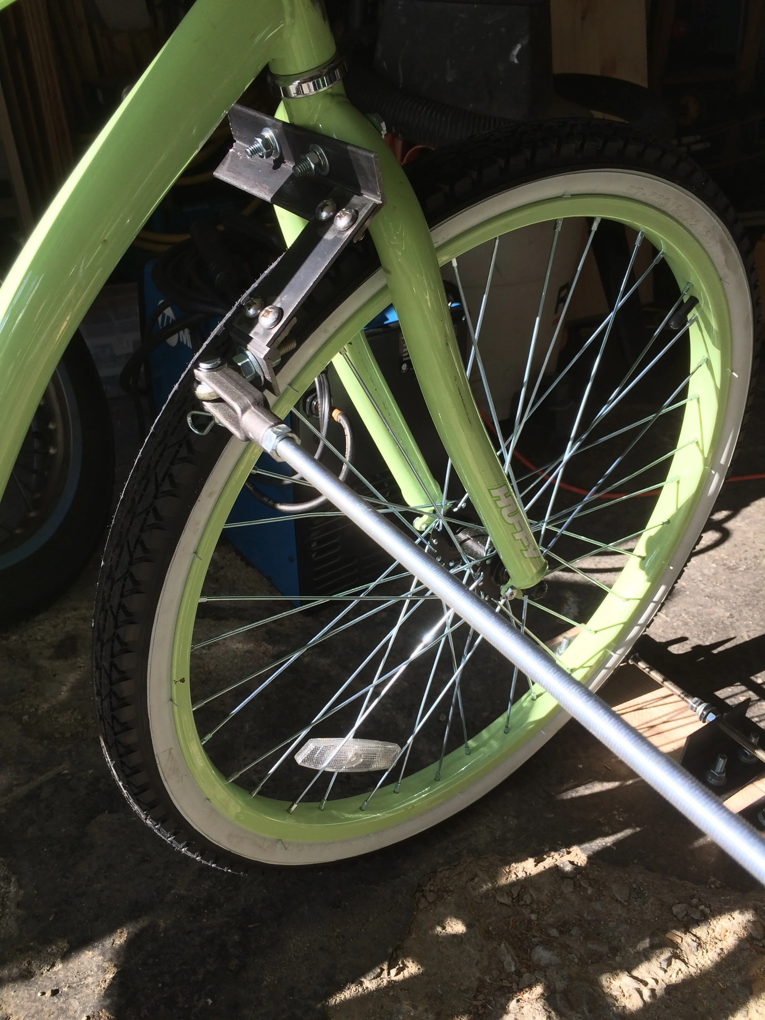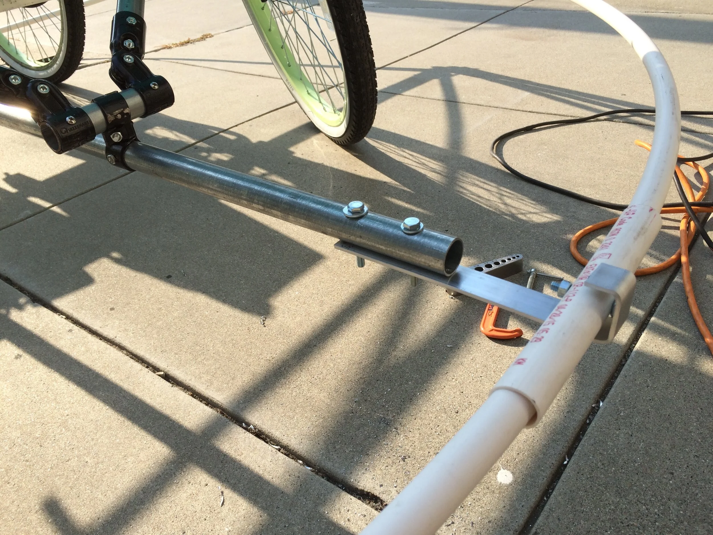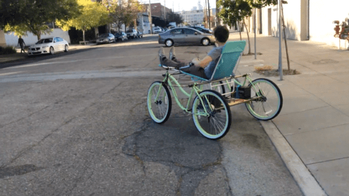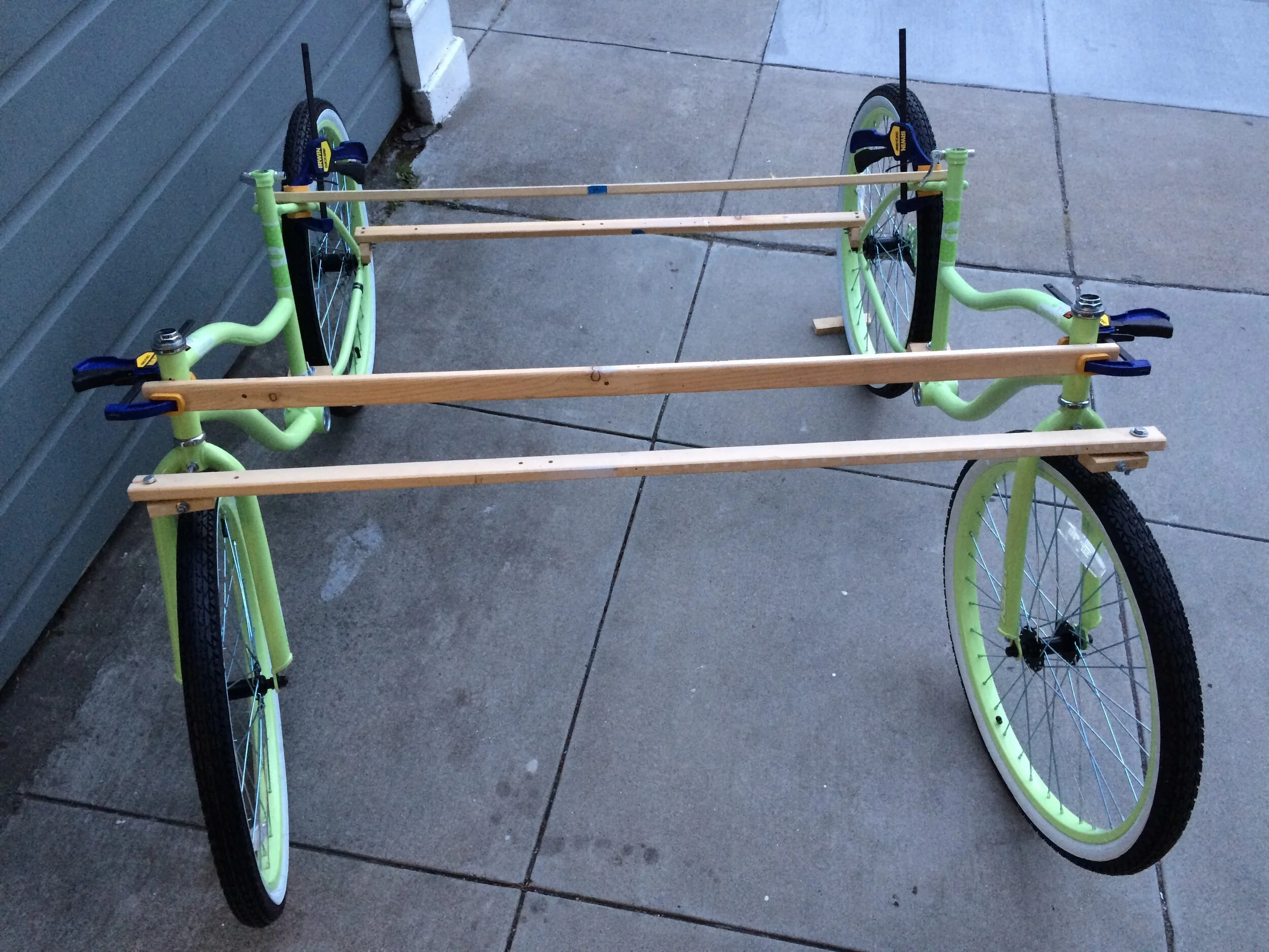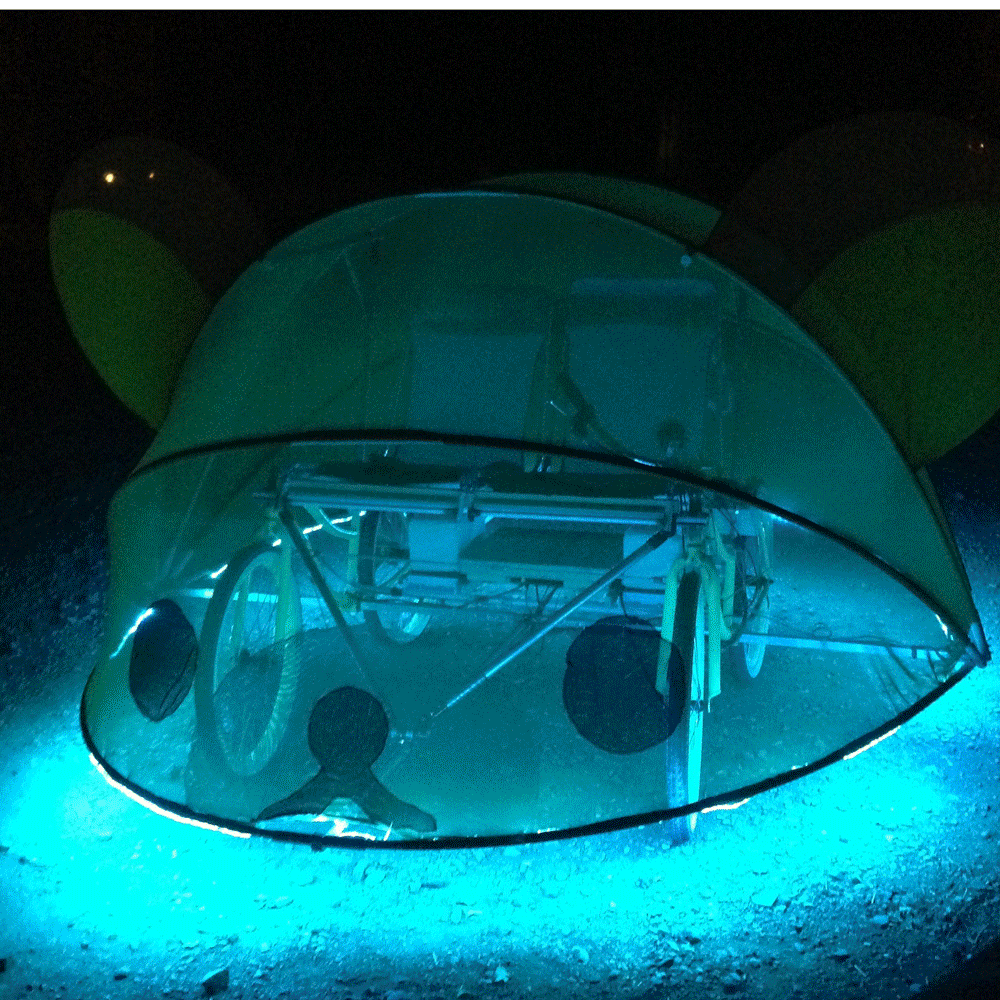 The car is made from two bicycles joined by parts that Garth fabricated to hold them together. In particular, he linked the front wheels via ball joints which implemented Ackermann steering geometry to drive the car. It is powered by two 350-watt motors. The outer shell is made of PVC pipe and sewn, stretched fabric.