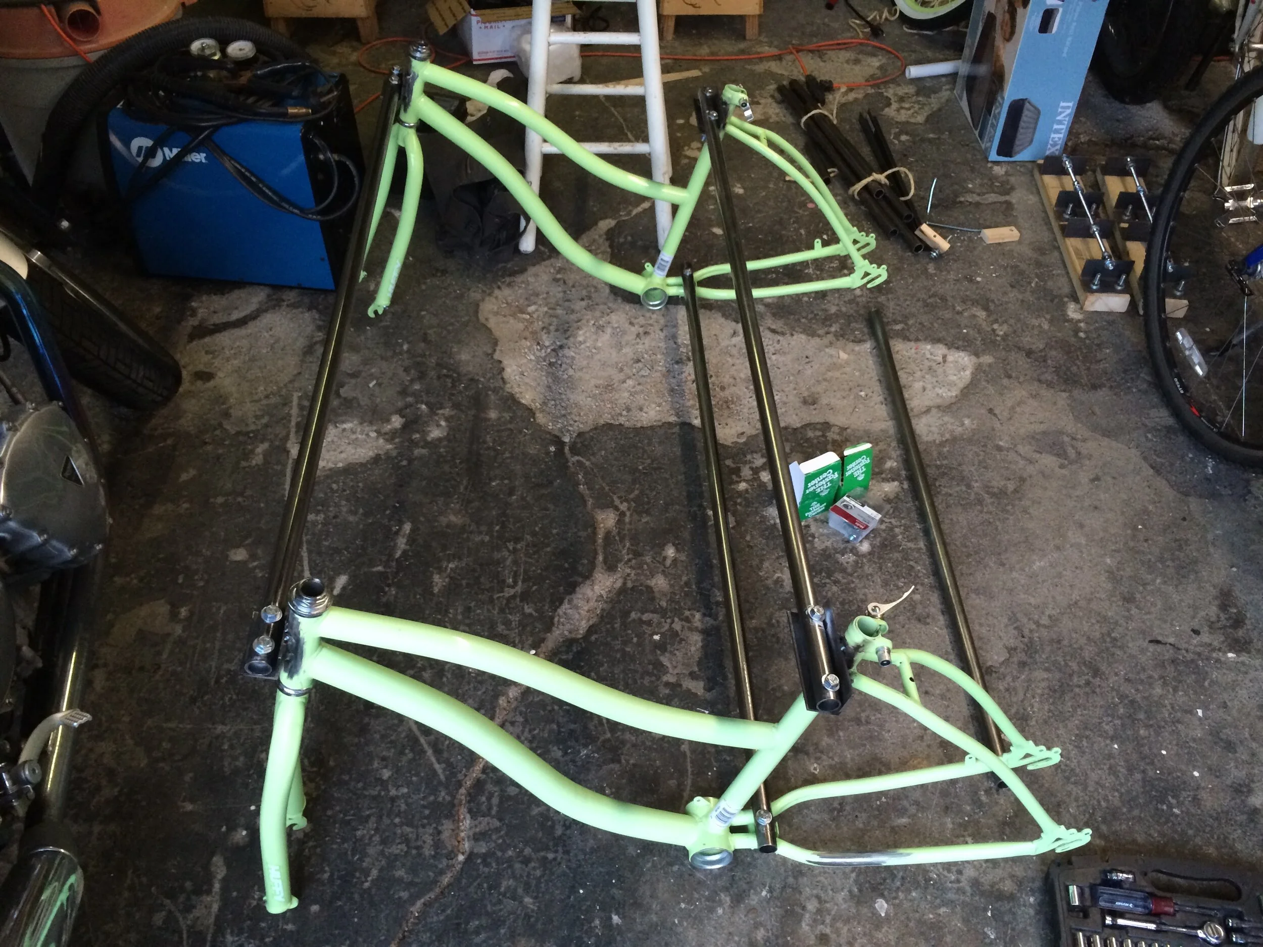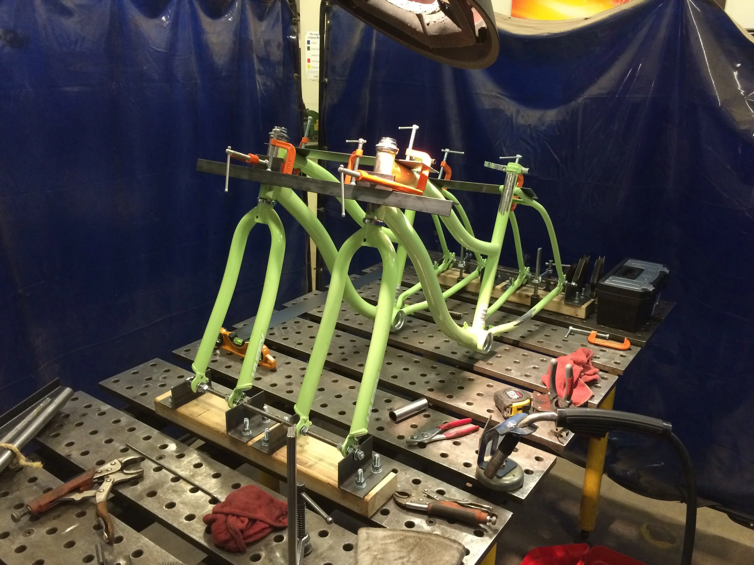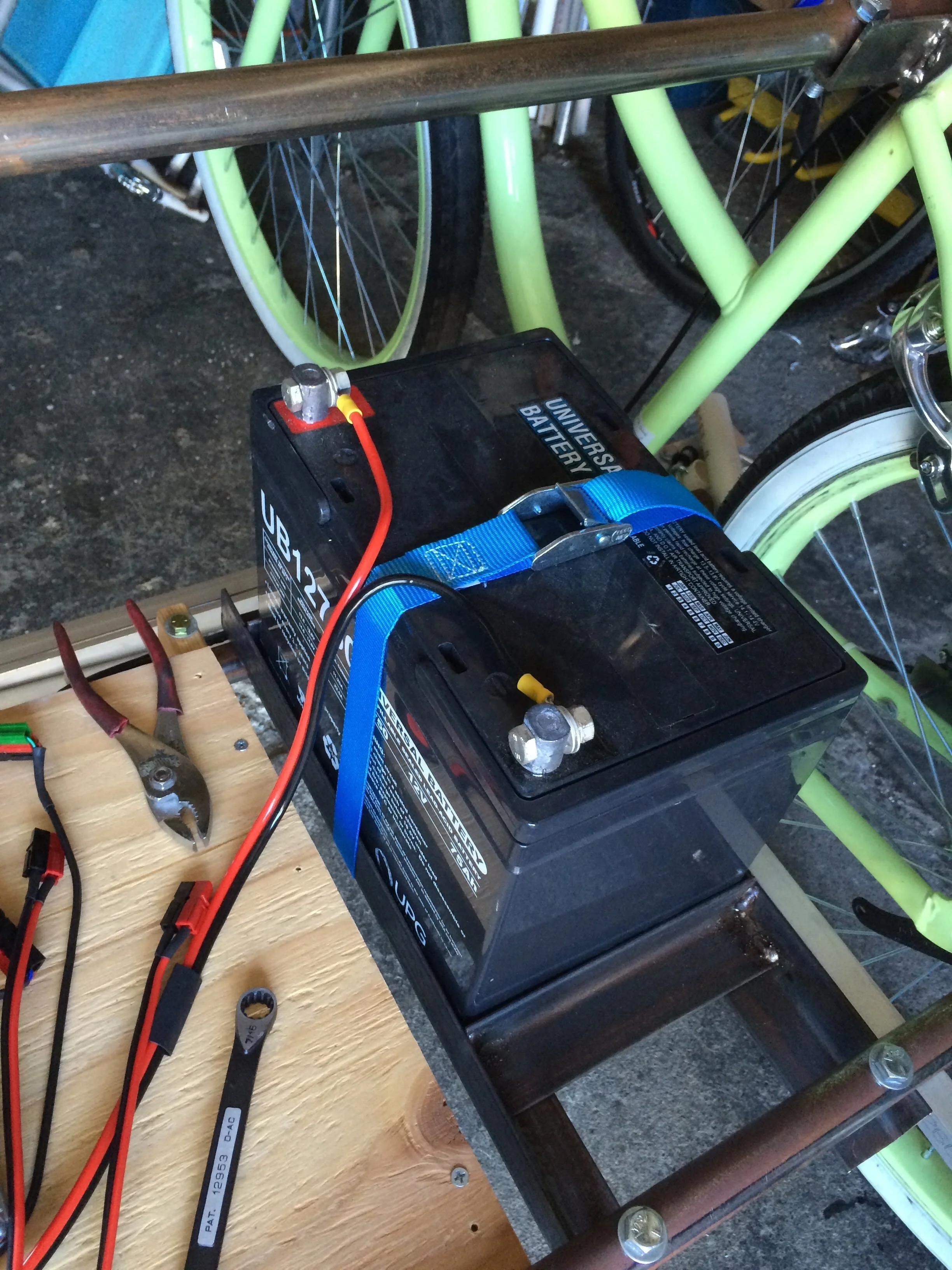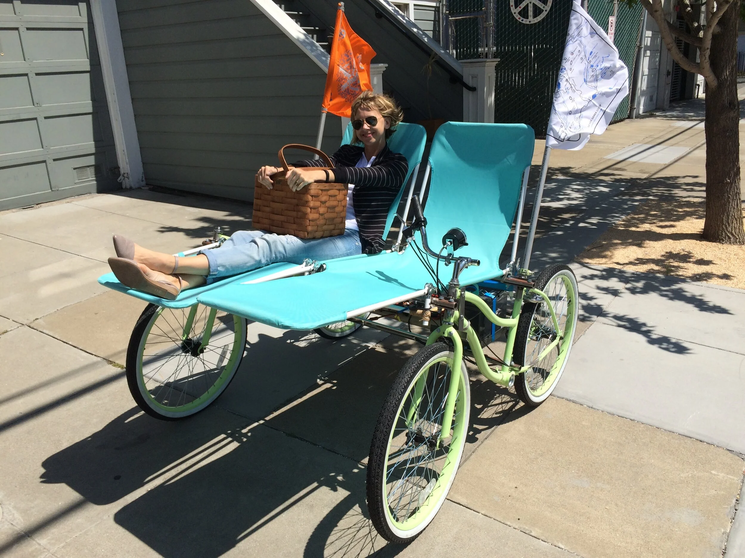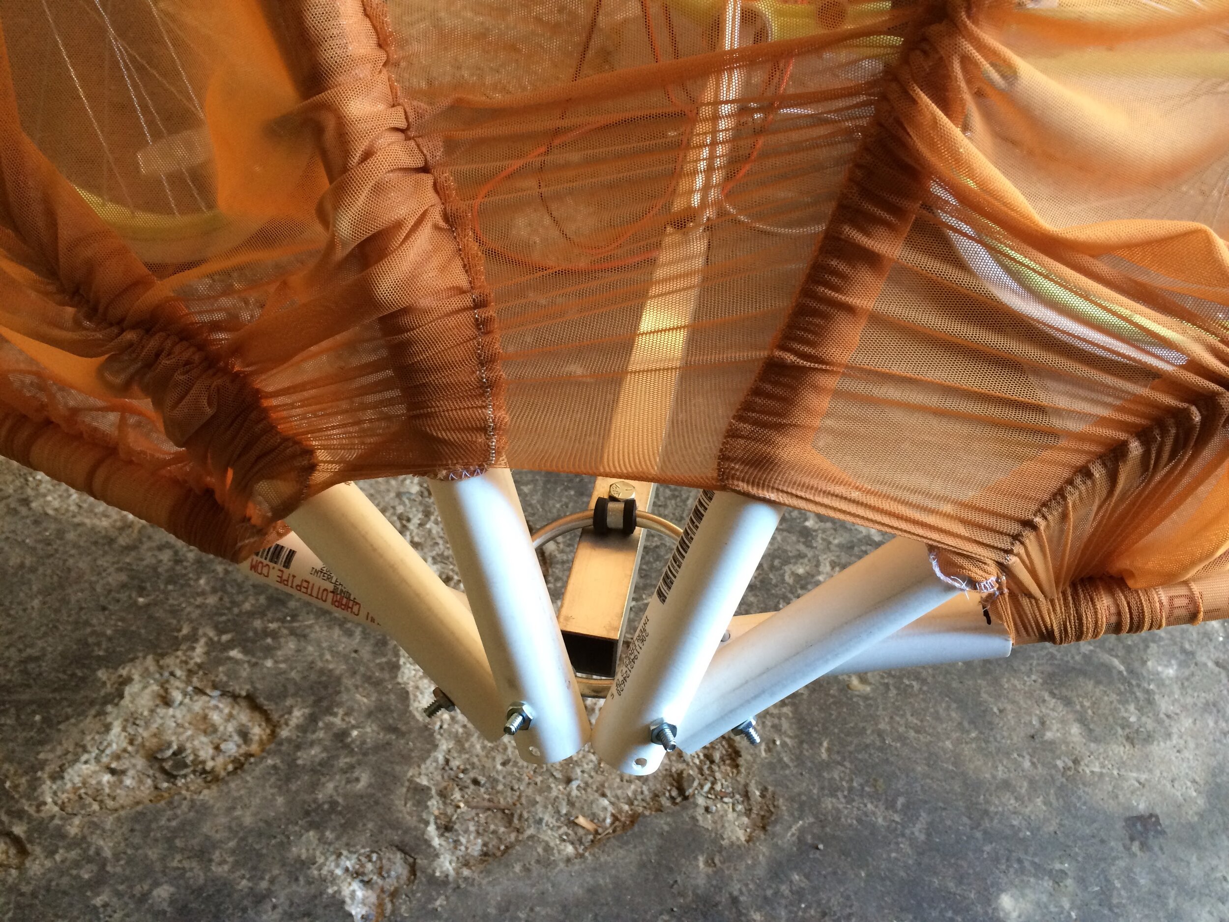 The car is made from two bicycles joined by parts that Garth fabricated to hold them together. In particular, he linked the front wheels via ball joints which implemented Ackermann steering geometry to drive the car. It is powered by two 350-watt motors. The outer shell is made of PVC pipe and sewn, stretched fabric.