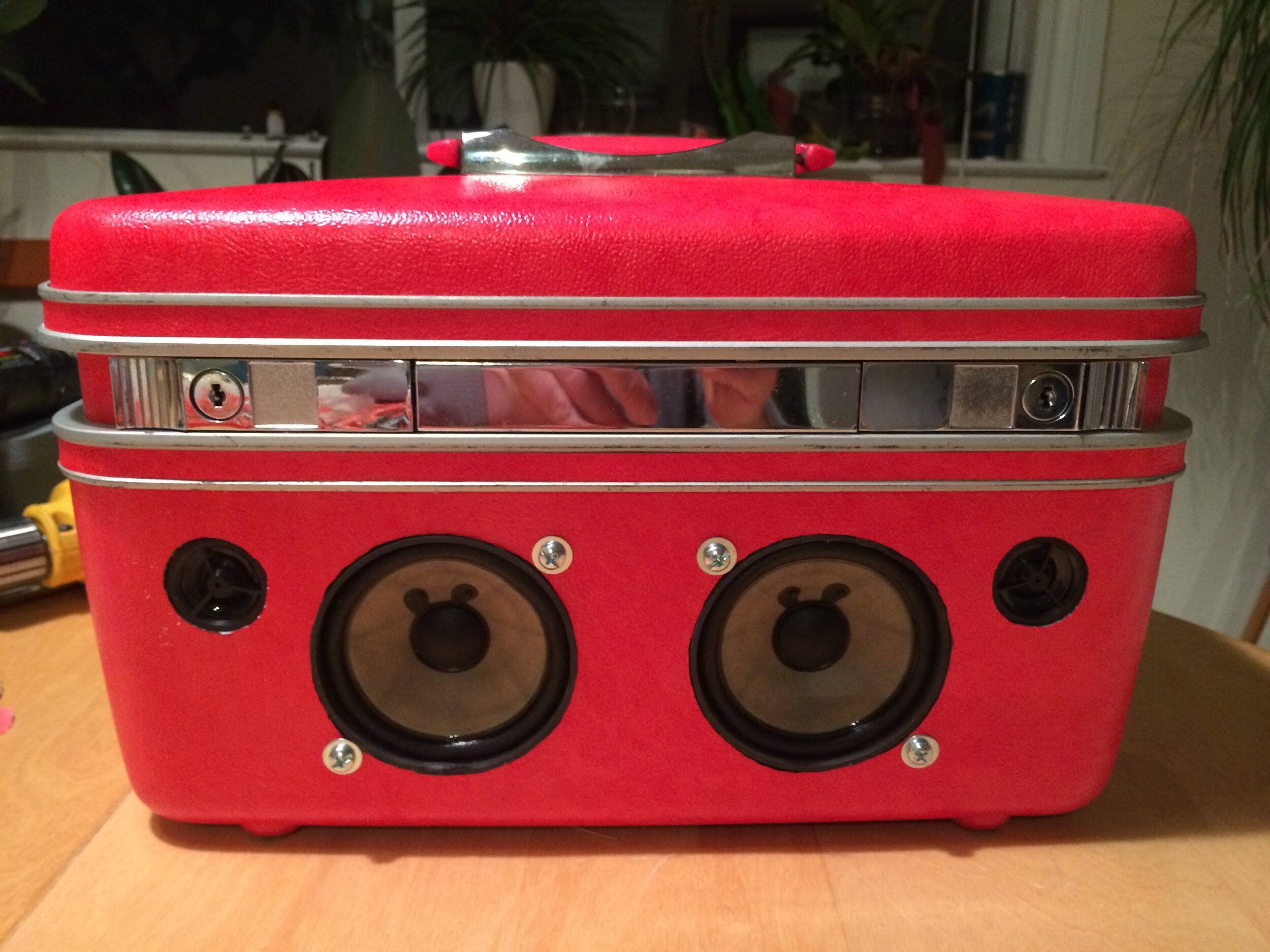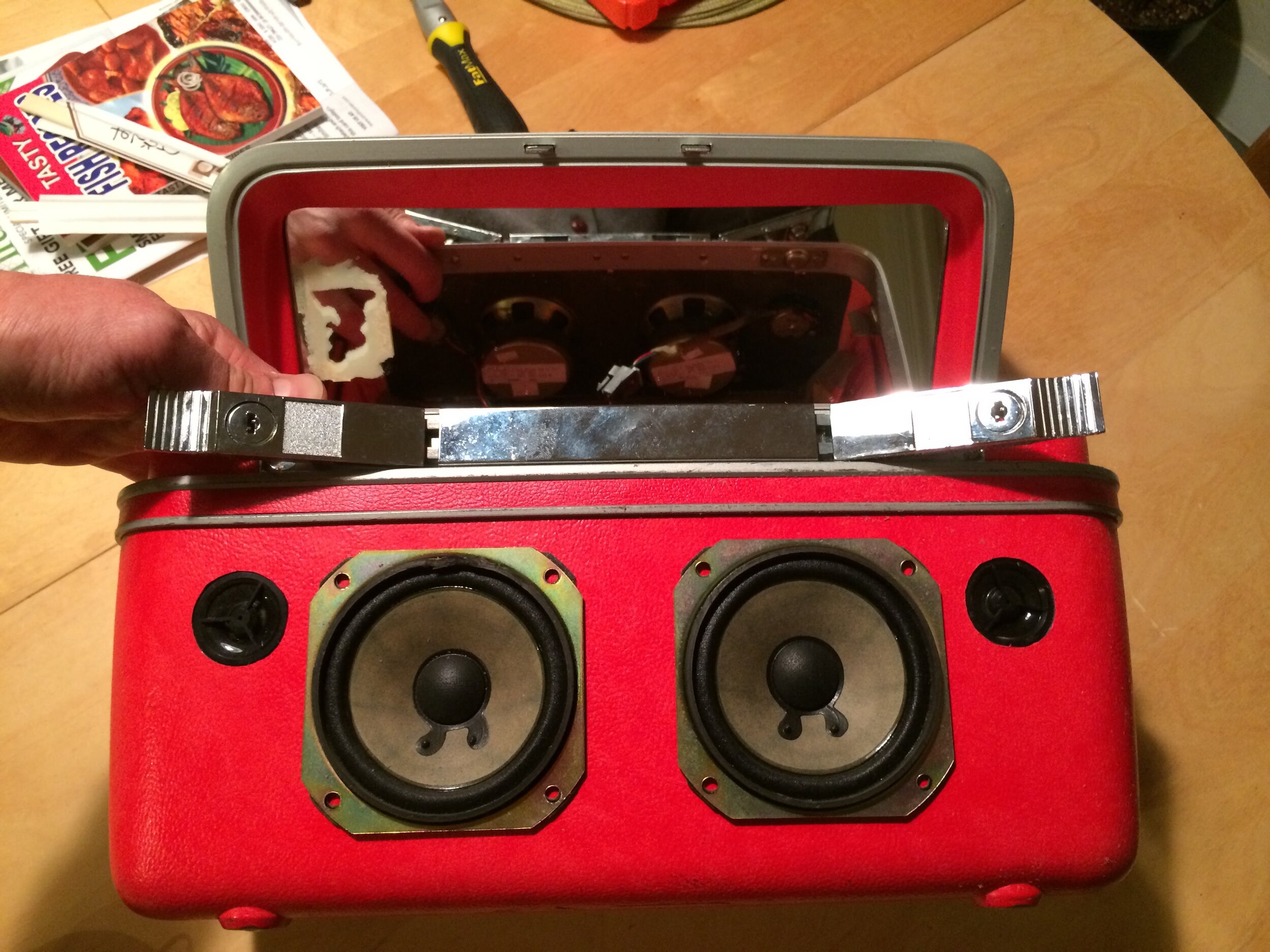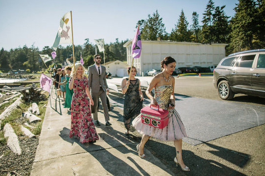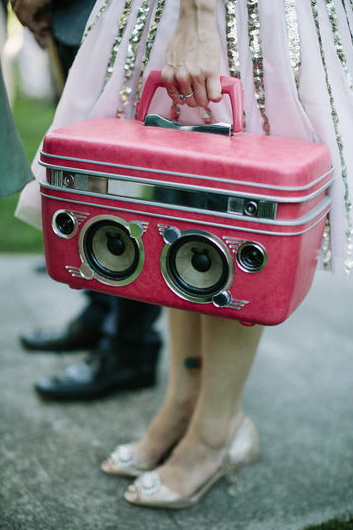Jen and Garth were commissioned to create a set of boombox suitcases for their friends' wedding parade. They fabricated the boomboxes with the help of their friends and Garth determined a method for synchronizing them while the wedding party paraded around the wedding site.