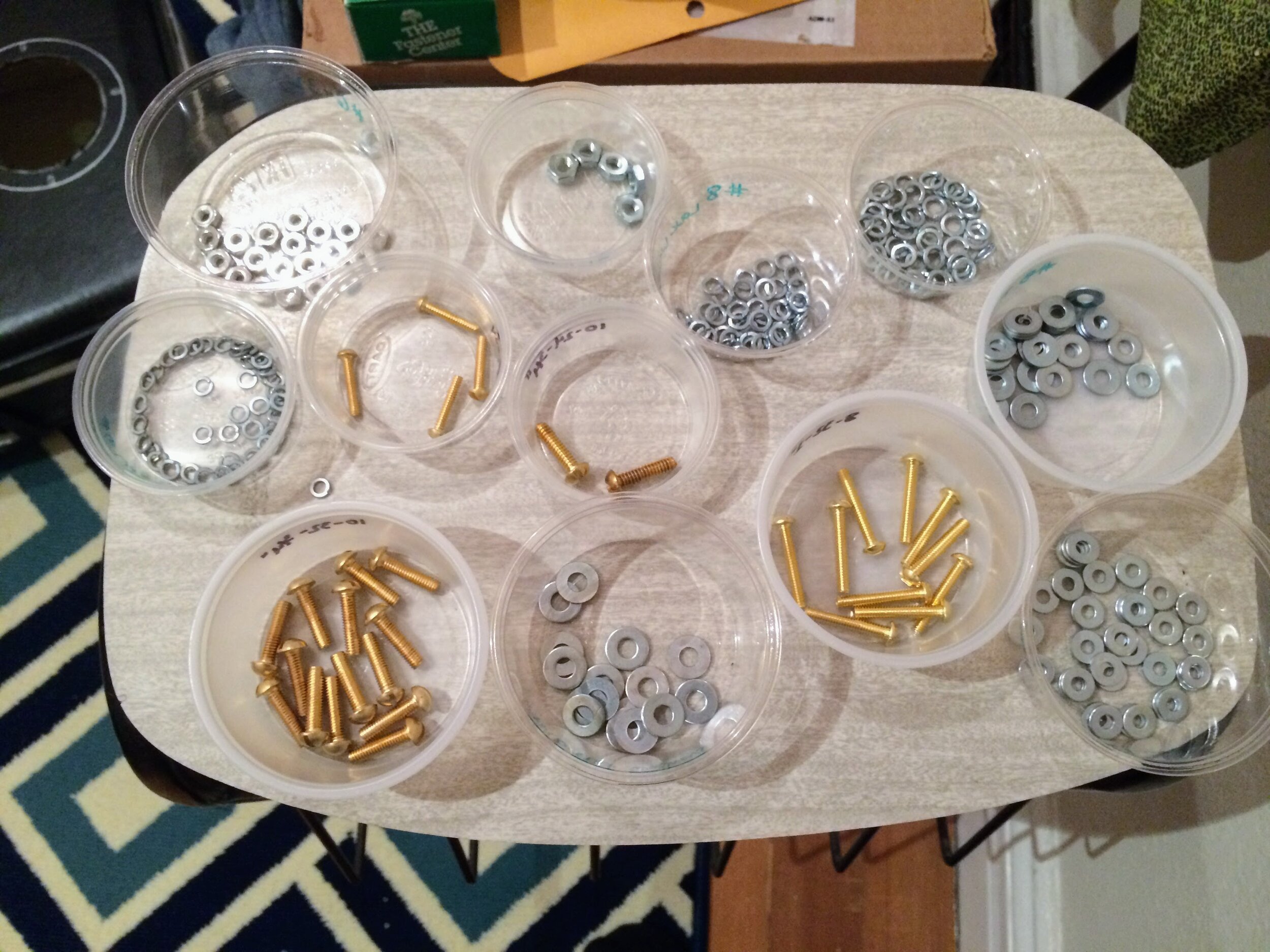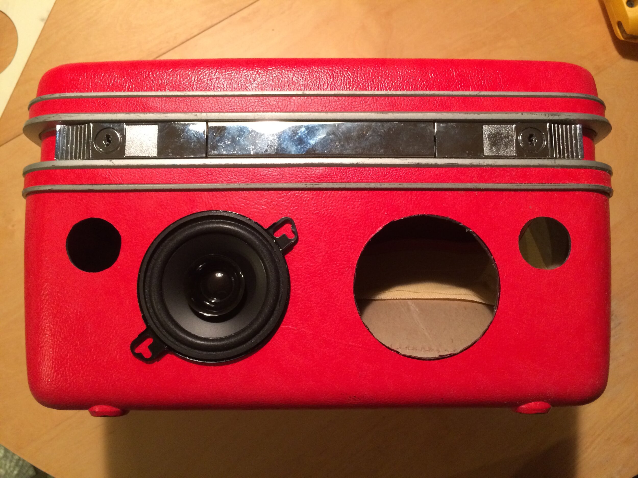 All boomboxes were hand cut and outfitted with recycled car speakers and radio receivers. All radios were tuned to the same station that was being transmitted by someone holding a transmitter that was playing the parade playlist. This allowed all the boomboxes to sync while parading nearly a mile around the wedding site.